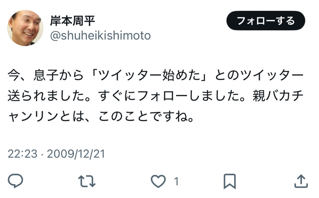 岸本周平さんが自身のSNSで、息子さんから連絡をもらったことを投稿しています。